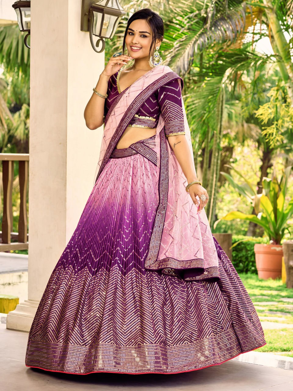 This beautiful purple lehenga is made from high-quality chinon material, featuring intricate thread embroidered work and sequin detailing for a touch of sparkle. Paired with a matching choli that boasts the same exquisite embroidery and sequin work, as well as a light purple net dupatta with sequin work and an attractive lace border, this set is a show-stopper.